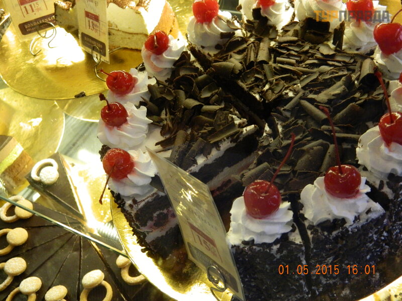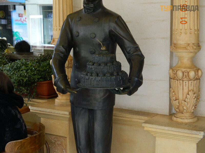 Easy to find: walk through the Peace Square to the end, near the monument to M. Muncachi (his bust is somewhat resembled a bust of Karl Marx), turn left into the passage. And on the left we are looking for the figure of a chef with a cake topped with cherries: