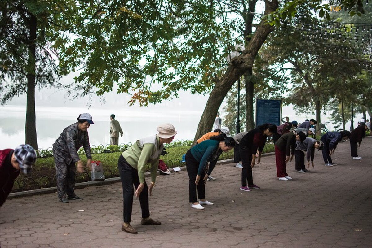 Why did we go to meet the dawn on the lake? At first, we really hoped to see the dawn, since we were on the west coast. And secondly, many Hanoi people come to the Lake of the Returned Sword in the morning to... do exercises! We also really wanted to see them)